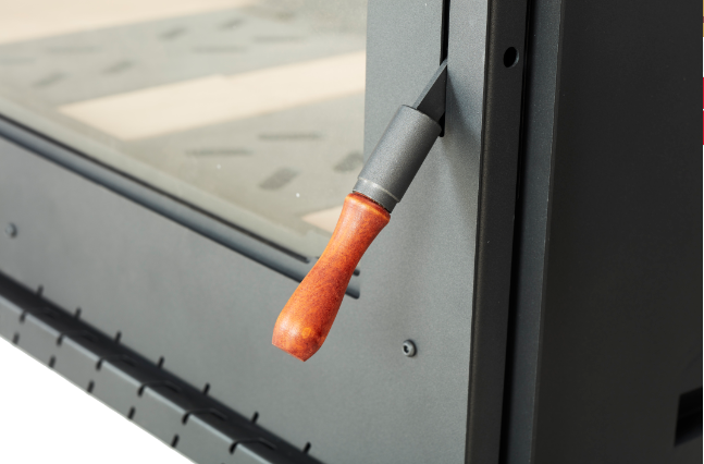Con sus ceniceros incorporados permite una fácil limpieza del equipo y su renovado sistema de aire forzado permite al usuario derivar el aire caliente circundante del equipo hacia el frente, brindando un mayor nivel de confort o en su defecto, guiar el aire a ambientes adyacentes para aclimatar los mismos.
